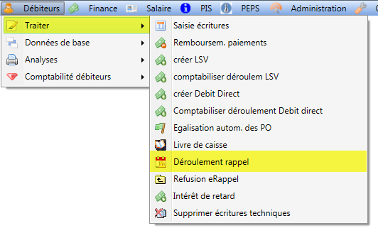 Point de menu: Débiteurs\Traiter\Rappel Les rappels débiteurs peuvent être réglés de façon très précise et utilisés selon les besoins. Il existe un manuel séparé dans lequel l'ensemble de la configuration et de l'ensemble du processus sont décrits en détails.