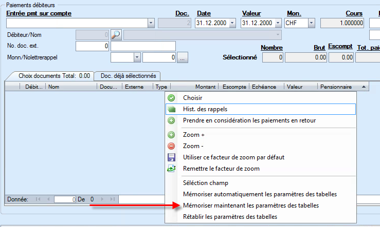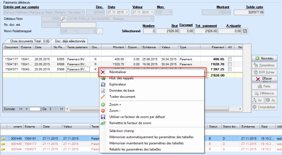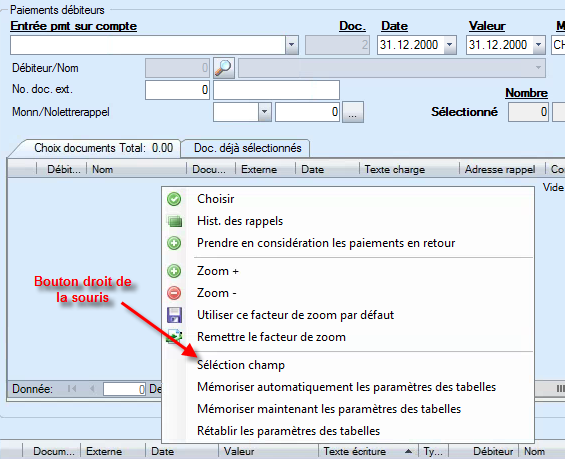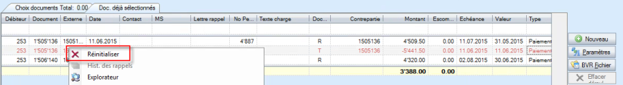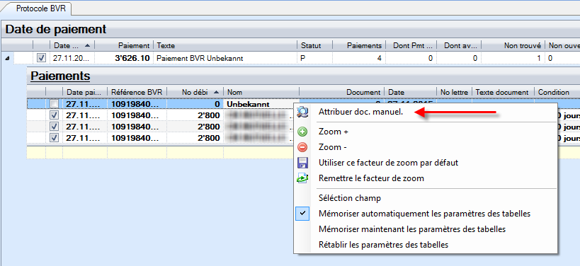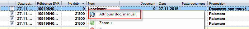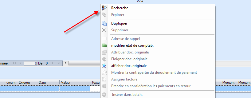Chercher le paiement dans la grille au moyen d'un clic droit sur le document désiré: