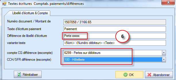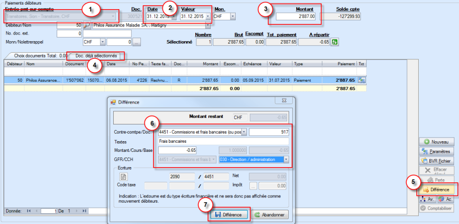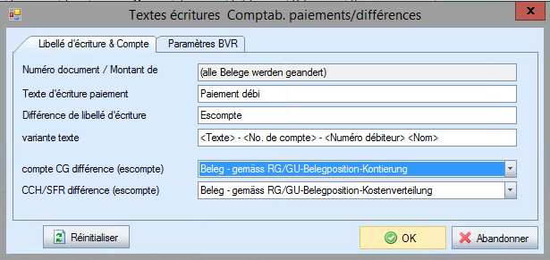 Dans le masque de paiement, on trouve dans tous les cas les réglages pour la comptabilisation des différences. Ces réglages doivent être saisis une fois pour chaque utilisateur.