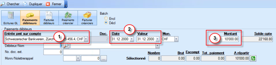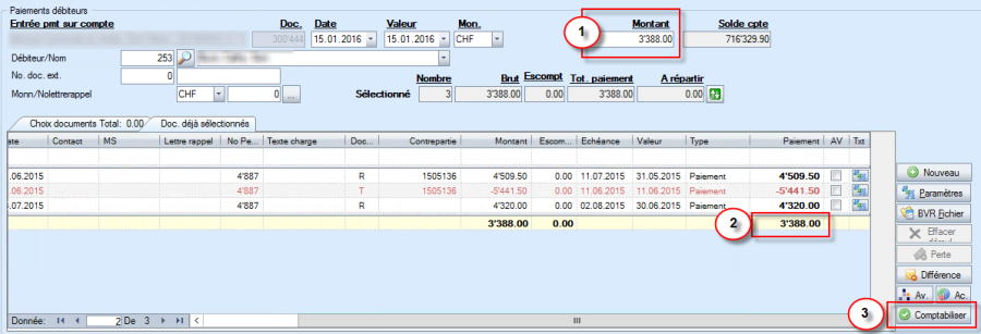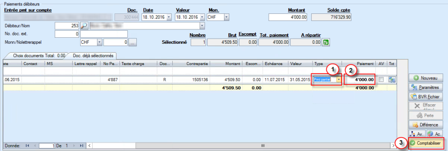 Dans l'en-tête de paiement, la relation de paiement (1) sera choisie en premier, puis la date (2) et finalement le montant du paiement (3).