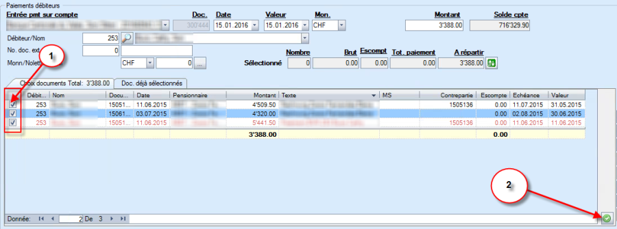 Dans ce menu, le déroulement à comptabiliser est choisi. Si un paiement n'a pas été effectué, il est possible de désélectionner le débiteur.