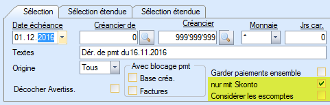 - 'Nur mit Skonto': Activé propose le cycle de paiement seulement les documents qui ont, avant la „Date d'échéance" et les jours de carence un escompte selon les conditions de paiements introduites. Le but étant d'autoriser les paiements pour des factures avec escompte.