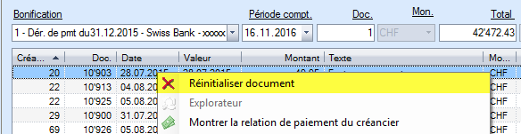 b) Supprimer un paiement : Un poste peut être supprimé du déroulement : Clic droit de la souris – 'Réinitialiser document':