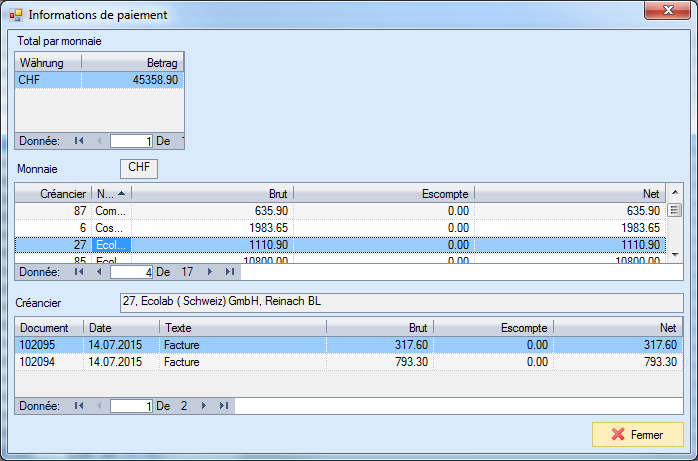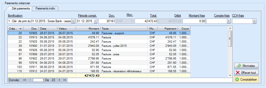 - 'Monnaie' : Il est plus pratique d'effectuer un déroulement de paiement pour chaque monnaie, par ex. seulement en CHF ou en EUR.