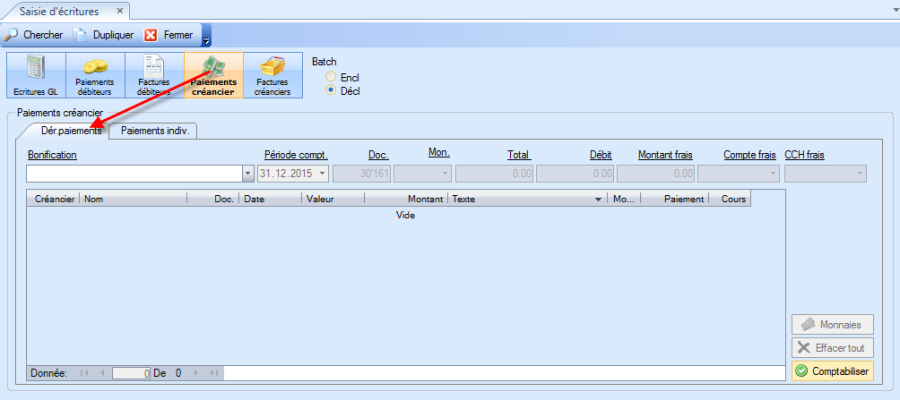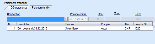 Menu : Finance\Saisie d'écritures : Transaction: Paiements créancier : onglet 'Dér. paiement' :