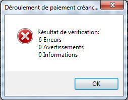 - Le bouton Vérifier dans la barre des boutons permet de vérifier le déroulement et s'il contient des erreurs. Lorsqu'il y a des erreurs, le message suivant apparaît :
