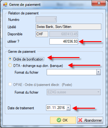 - Modifier éventuellement également la date de traitement du DTA / OPAE si nécessaire si les paiements doivent être lus via le e-banking.