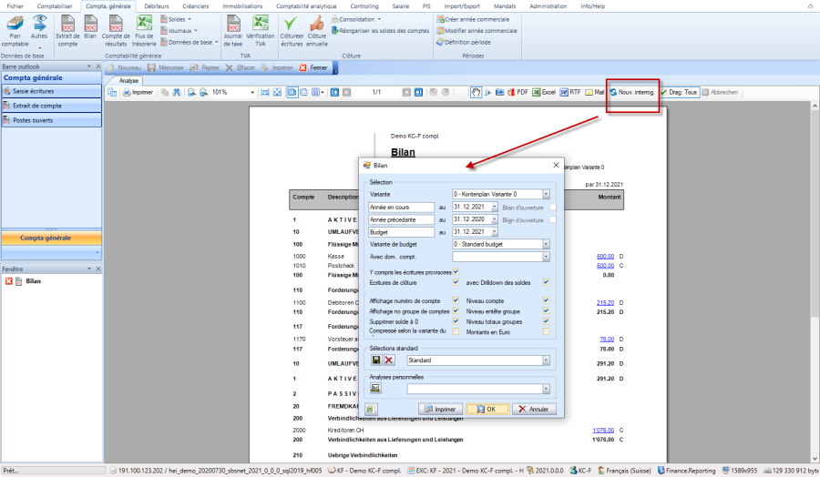 Si, après avoir ajusté les entrées ou les données (par exemple, pour d'autres périodes, d'autres façons d'afficher les données ou après des écritures effectuées entre-temps dans une autre session), l'évaluation doit être mise à jour et affichée à nouveau, l'écran de sélection peut être appelé à nouveau via la fonction "Nouvelle interrogation".