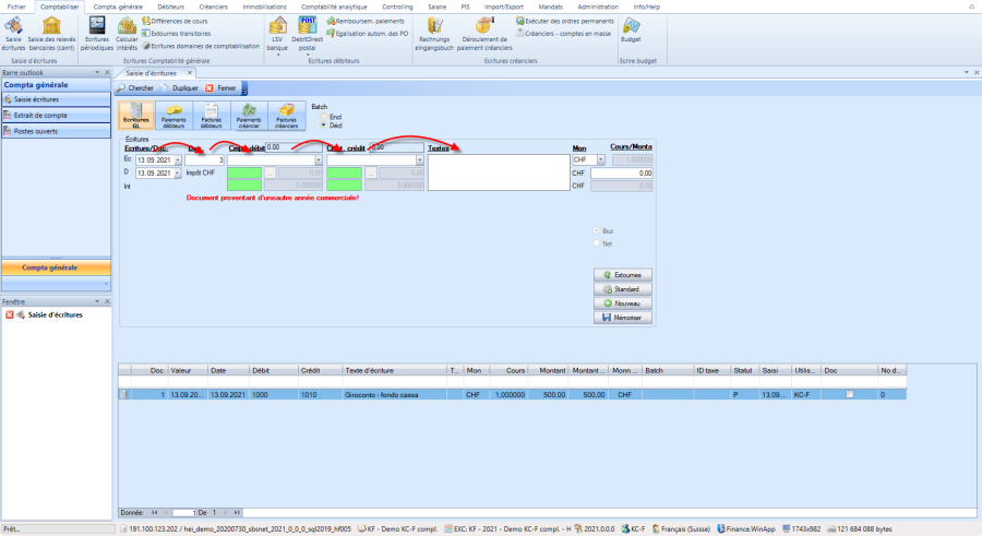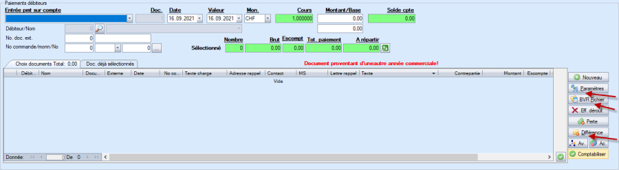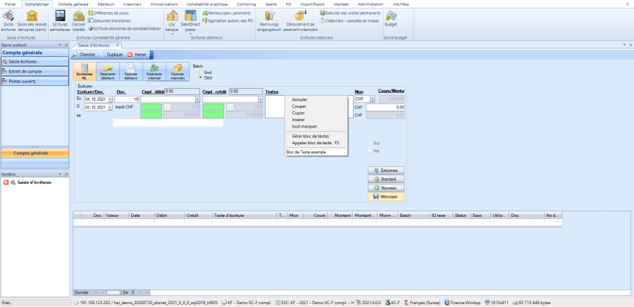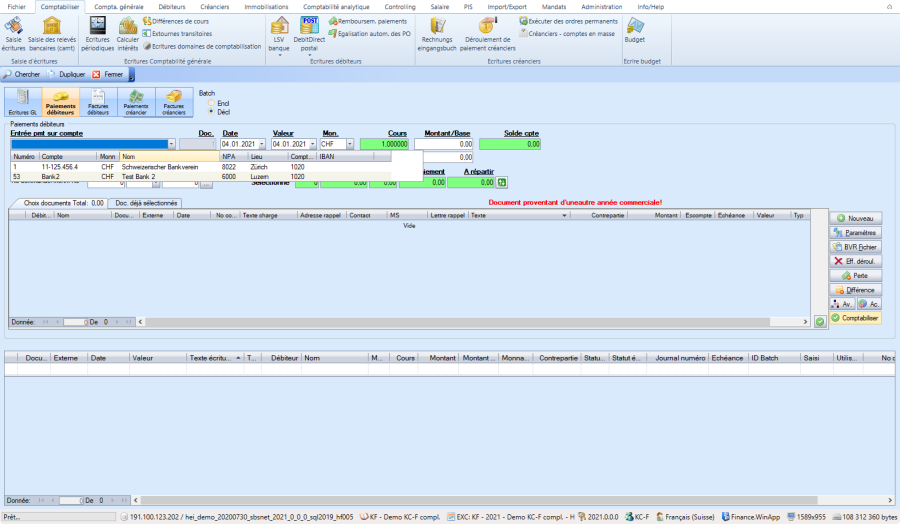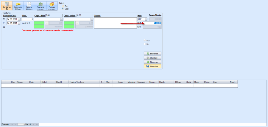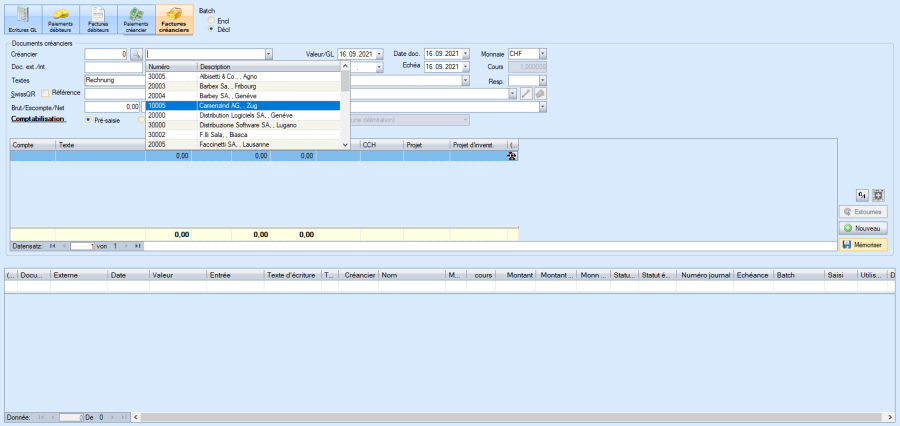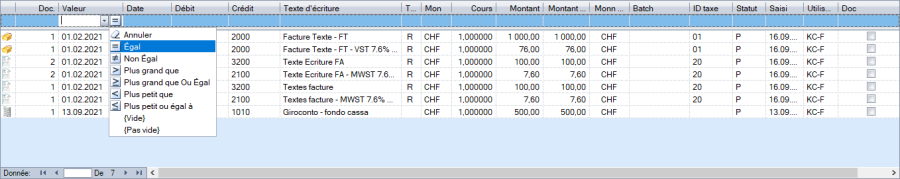 Dans les masques d'enregistrement, il est également possible de rechercher les différents critères dans la grille inférieure, par exemple par numéro de document, date ou montant.