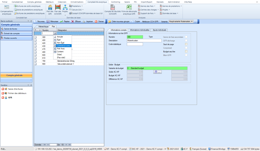 Il existe également une fonction de recherche rapide dans le domaine des plans de comptes, des types de coûts et des centres de coûts.
