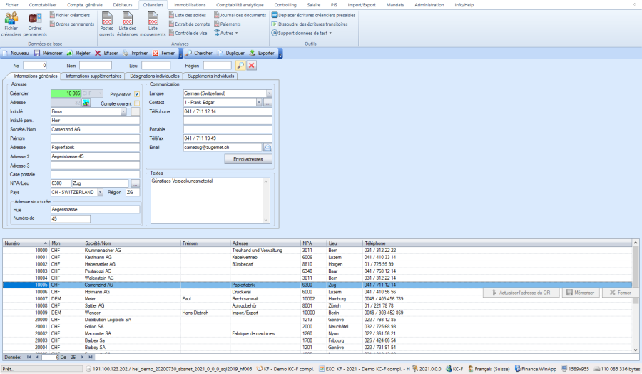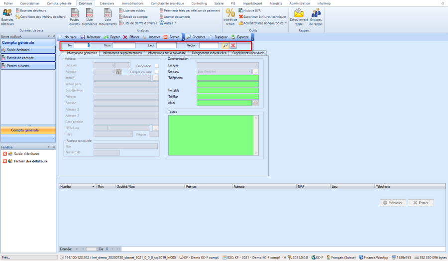 L'application dispose d'une barre de recherche dans la zone des données de base débiteurs / créanciers dans laquelle peut être filtrée très rapidement par le numéro, le nom, la ville ou la région.