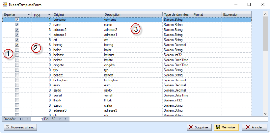Toutes les colonnes supprimées sont affichées via la fonction "Sélection champ".
