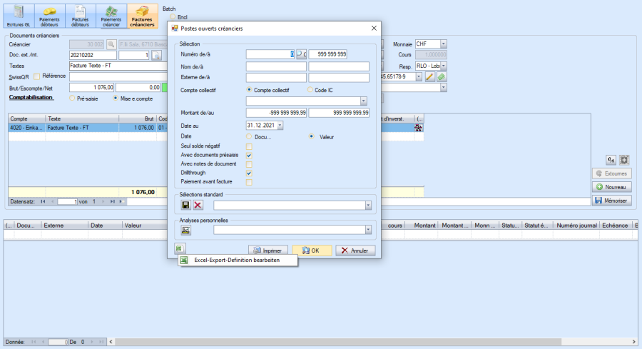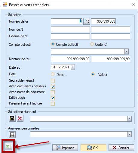 Dans certains évaluations, le bouton avec le symbole EXCEL peut être utilisé pour enregistrer les données directement dans un fichier EXCEL sans devoir l'ouvrir avant. Cette fonction est disponible dans de plus en plus d'évaluations (par exemple, relevé de compte, bilan, compte de résultat, liste des postes ouverts et des transactions, etc.)