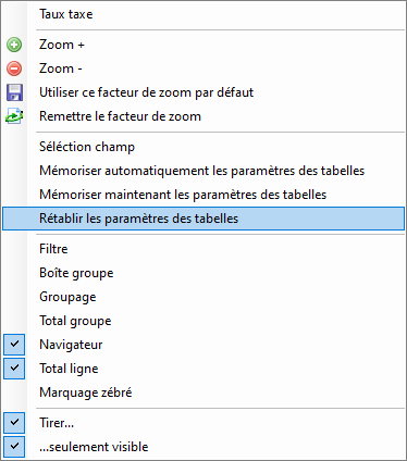 Lorsque la fonction «Rétablir les paramètres défaut des tabelles» est sélectionnée, la grille est réinitialisée par défaut (colonnes affichées et ordre).