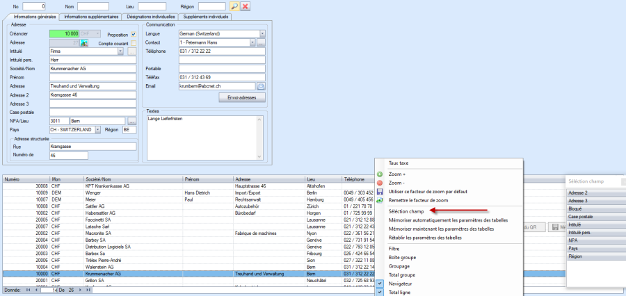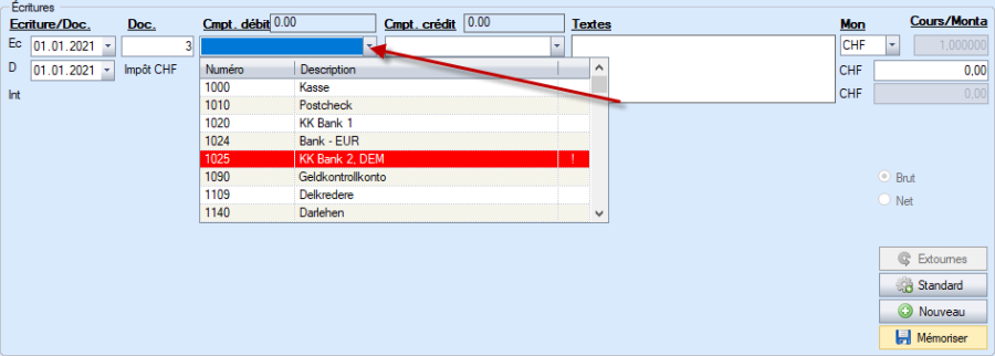 La sélection peut être effectuée en affichant la liste des données de base correspondante (Alt + flèche vers le bas), puis en cliquant avec la souris.
