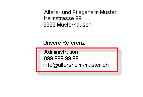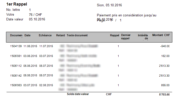 La conception de la mise en page des rapports est une question de goût ! Les adresses sont parfois à gauche, parfois à droite et doivent correspondre à la fenêtre de l'enveloppe. Une société utilise un numéro de document plus long et/ou un logo, etc. Les lettres de rappels sont presque toujours personnalisées selon les spécificités souhaitées par le client. C'est pourquoi, la lettre de rappel standard prédéfinie est adaptée aux différents besoins individuels selon les possibilités au moyen de „Custom Reporting". Votre conseiller, respectivement l'organisation de soutien, est à votre disposition pour vous aider à atteindre cet objectif.
