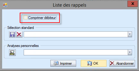 Remarque 1: Si „Archiver en PDF les lettres de rappel imprimées" est activée, une copie PDF est enregistrée dans la base de données. A tout moment ces rappels peuvent être consultés et affichés (dans Rappels dans les données de base débiteurs)
