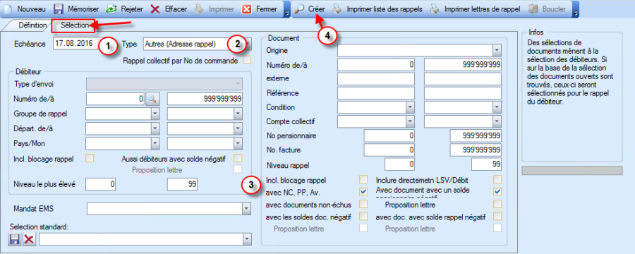 Remarque 2: Enregistrer les paramètres par défaut en sélection standard pour que le formulaire soit toujours chargé correctement (par exemple, l'archivage des rappels activé, la lettre de rappels correctement choisie, etc.)
