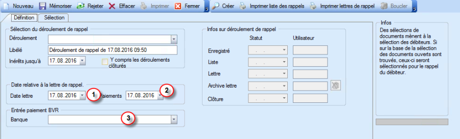 La date de la lettre n'a pas de fonction sélective. Elle est utilisée dans le rappel et peut différer de la date du déroulement (par ex. le déroulement est créé le vendredi mais les rappels ne seront envoyés que le lundi suivant). De plus, quand le déroulement est fermé, la date de la lettre servira de date de dernière relance et définit le prochain niveau de rappel.