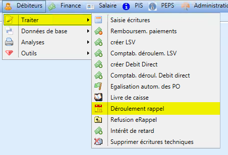Point de menu : Débiteurs\Traiter\Déroulement rappel Dans les pages suivantes, un processus de rappels est décrit au travers des différentes étapes :