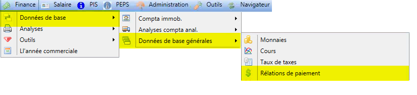 Point de menu : Finance\Données de base\Données de base générales\Relations de paiement Choisir la relation de paiement appropriée et aller dans l'onglet BVR: !worddav0e4f316bc61886d307b9291c7cfee73f.png|height=256,width=605!Ici, le numéro de client (seulement pour la banque), le numéro de participant et la composition du numéro de référence à 27 positions sont paramétrés.