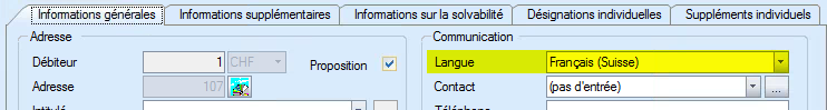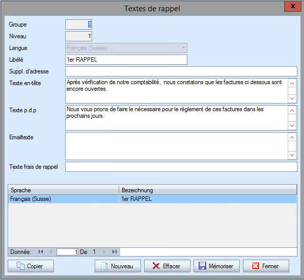 Remarque : Même si la langue utilisée généralement est le français (Suisse), il est possible d'utiliser une autre langue pour les rappels. Le texte de rappel est chargé en fonction de langue sélectionnée pour le débiteur dans les données de base débiteur pour les rappels.