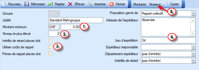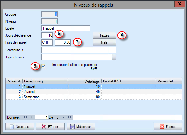 Dans les niveaux de rappel les jours d'échéance (6), les frais de rappel (7) et les textes de rappel (8) sont définis.