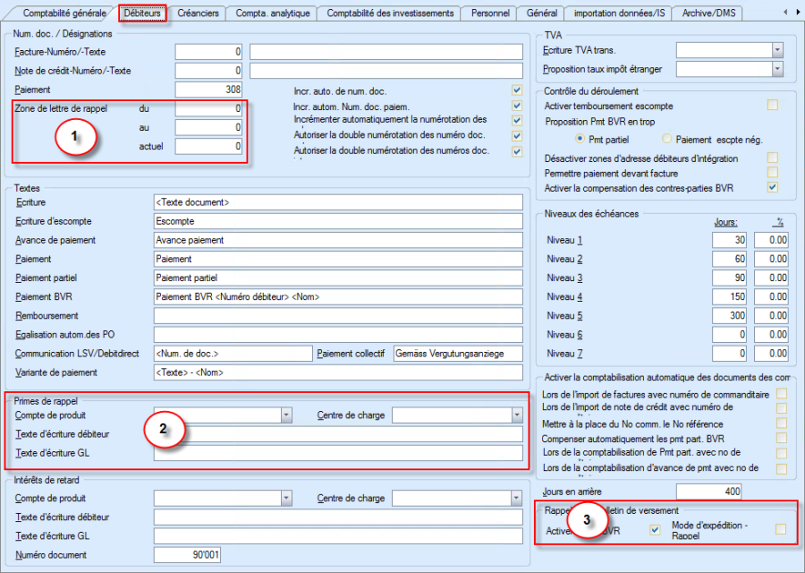 Point de menu: Finance\Outils\Paramètres Dans les paramètres généraux du programme dans l'onglet Débiteurs, les positions suivantes sont à définir.
