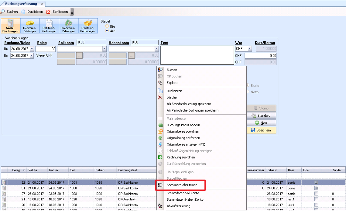 Dazu wird im Datengrid eine Buchung mit einem OP-geführtem Sachkonto mit der rechten Maustaste angeklickt. Im dann erscheinenden Kontextmenü wird der Punkt ‚Sachkonto abstimmen‘ gewählt. Die Bearbeitungsmaske erscheint und der Ausgleich kann vorgenommen werden.
