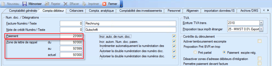 - Attention : La numérotation des rappels doit impérativement être différente de celle de l'année précédente, dans le cas contraire cela peut conduire à des conflits lors de la lecture des paiements BVR lorsque le numéro de rappel a été attribué 2 fois.