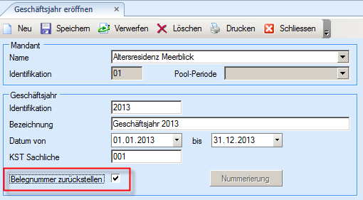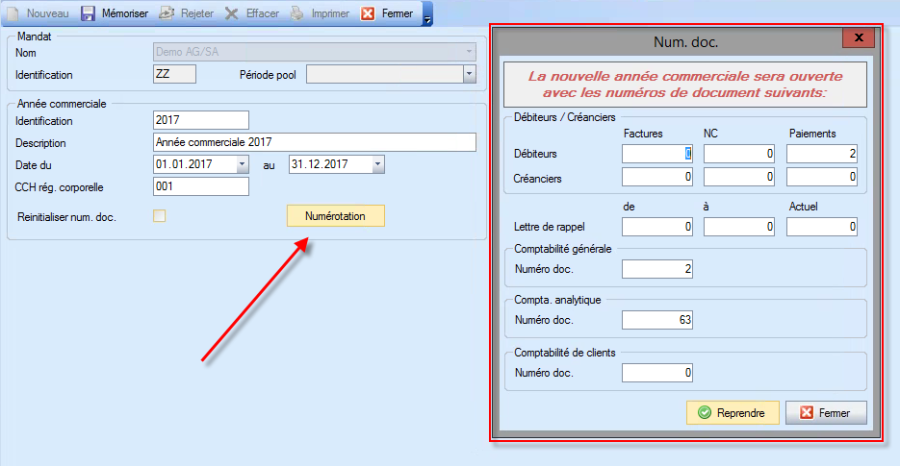 - Lorsque aucun paramètre n'est saisi (case „Réinitialiser num.doc" désactivée, le bouton „Numérotation" n'a pas été utilisé), les valeurs actuelles sont reprises dans la nouvelle année.