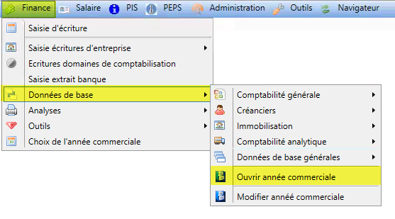 Ouvrir le menu Finance / Données de base / Ouvrir année commerciale