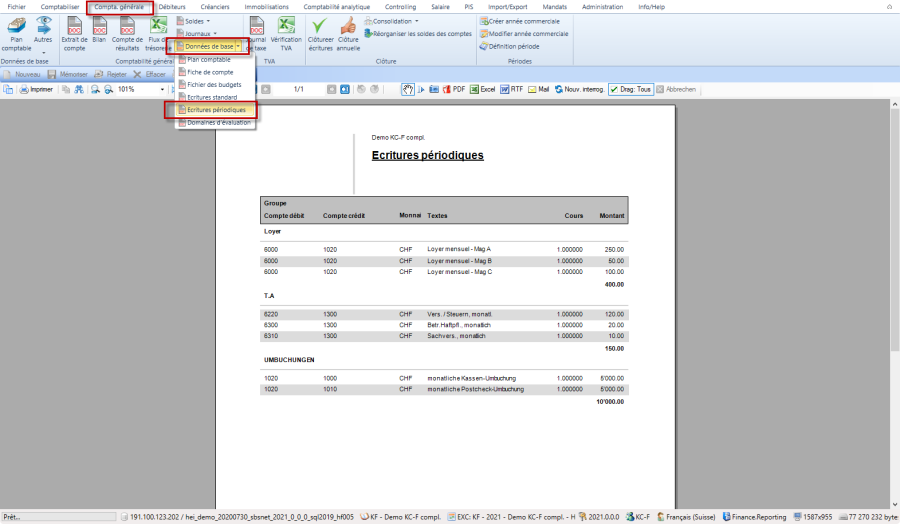 Sous Comptabilité générale / Données de base / Ecritures périodiques, il est possible de consulter la liste des écritures périodiques.