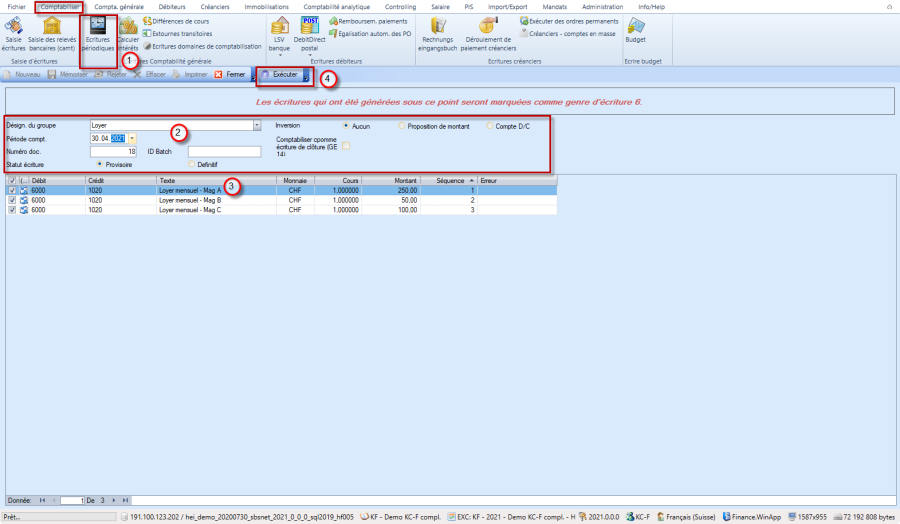 La fonction "Ecriture périodiques" (1) permet de préparer des écritures appartenant à un groupe. Sélectionner le groupe (2) et saisir les données manquantes et, après avoir vérifié les données préparées (3), lancer les écritures avec bouton "exécuter" (4):