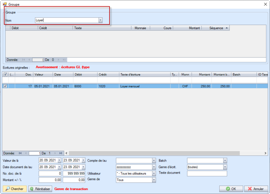 Les écritures périodiques existantes se composent d'un groupe d'écritures et d'écritures individuelles qui lui sont rattachées. Avec la fonction «Ecritures périodiques» (Compta générale / Données de base / Autres / Ecriture périodiques) vous pouvez modifier les groupes et les écritures individuelles correspondants.