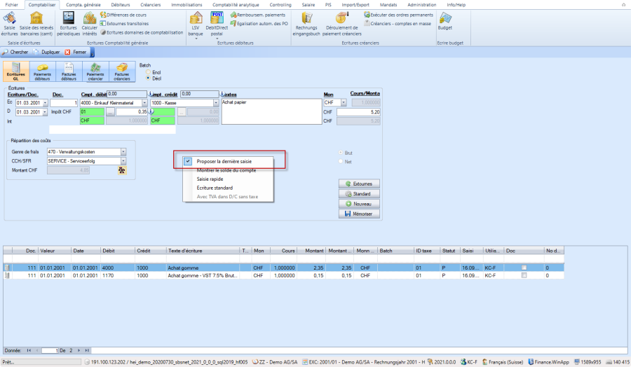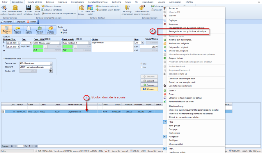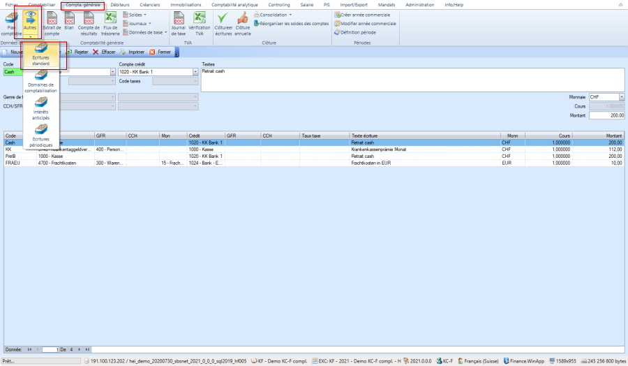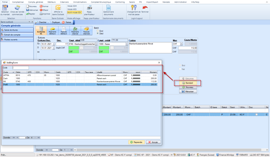 Les saisies récurrentes peuvent être appelées dans l'écriture de comptabilisation du grand livre via le bouton "Standard" et reprises comme modèle.