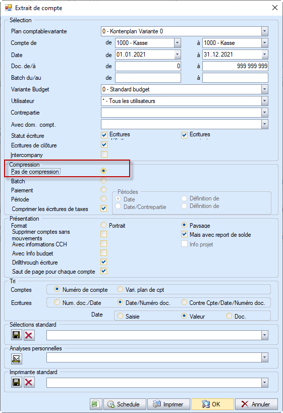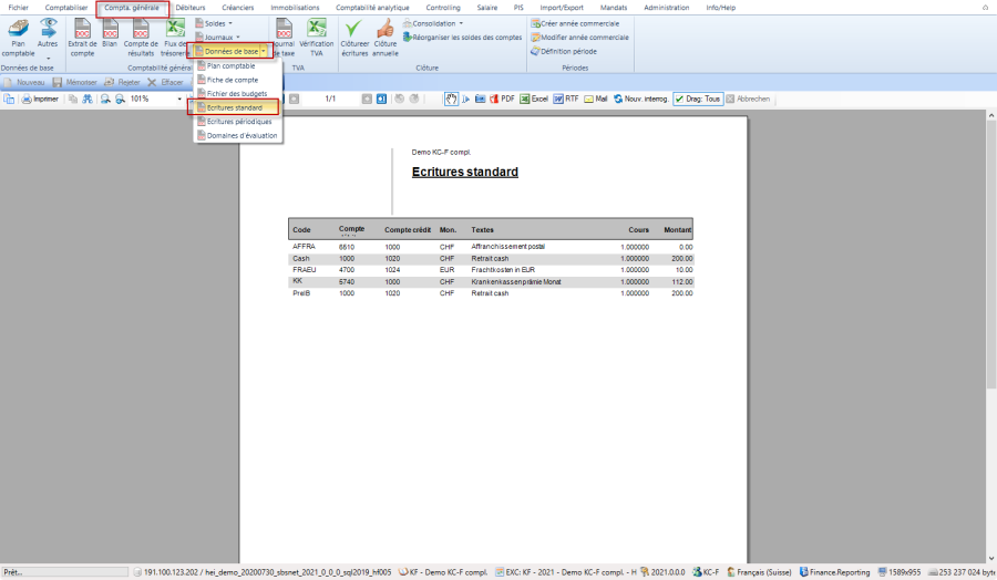 Avec la fonction Comptabilité générale / Données de base / Ecritures standard, il est possible d'imprimer une liste des écritures standard enregistrées existantes.