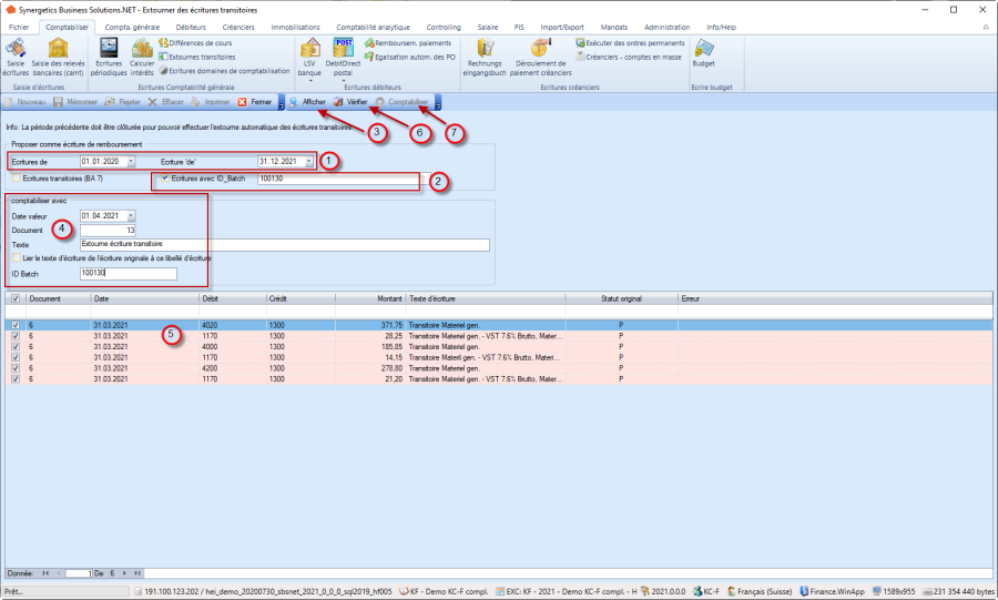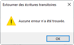 La fonction «Extourne transitoires» sert à la comptabilisation automatique d'écriture transitoires après la clôture annuelle dans le nouvel exercice ou l'éxtourner des écritures avec un ID d'un batch (par exemple: les écritures de régularisation) dans le mois suivant.