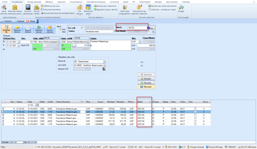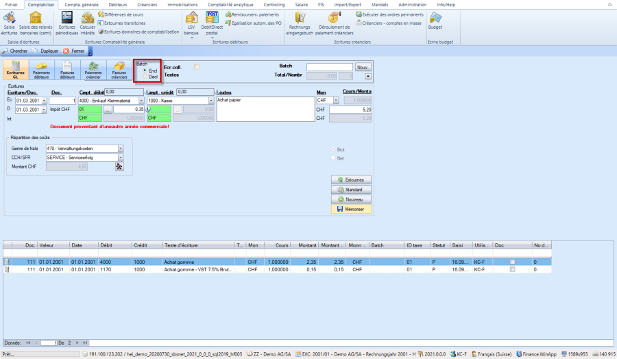 Lorsque le bouton "Batch" passe à "Encl", vous êtes en mode groupé/Batch: Les saisies multiples sont maintenues ensemble grâce à l'ID Batch.