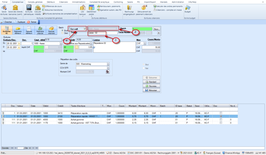 Si le champ "Ecr. Coll." (1) est activé en plus, on peut sélectionner un compte commun (2) et un texte commun (3), qui est appliqué à chaque entrée du Batch correspondant, par exemple caisse: