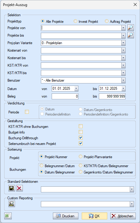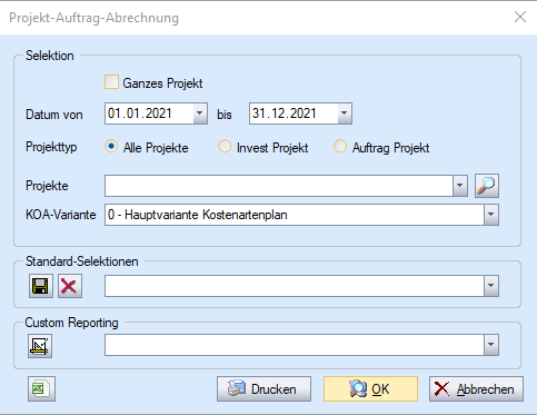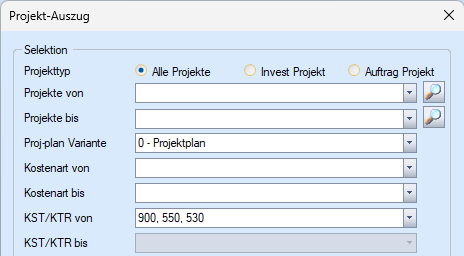 Projekttyp | Selektion, ob alle Projekte, nur Investitionsprojekte oder nur Auftragsprojekte (auch Fallprojekte genannt) ausgewertet werden möchten. |