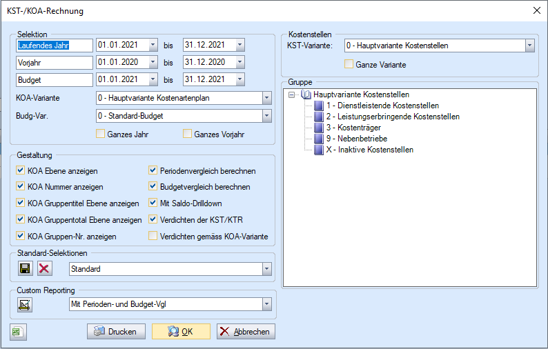 Gestaltung | KOA-Ebene Drucken Verdichten Mit Vorjahresvergleich Mit Budgetvergleich Hinweis: Für die Reportgestaltung mit Vorjahres- und Budgetvergleich muss der mitgelieferte Custom-Report „Mit VJ und Budget“ zusätzlich ausgewählt werden. |