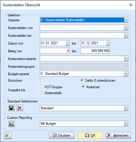 Kostenstellen bis | Konto, bis zu welchem die Kostenstellen-Übersicht ausgegeben werden soll. |