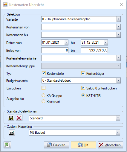 Ausgabe bis | (o) KST-Gruppe (o) Kostenstelle (o) Kostenart Hinweis: Beachten Sie, dass Ihre Selektion im Feld Kostenarten-Gruppe diese zusätzlich einschränken kann. |