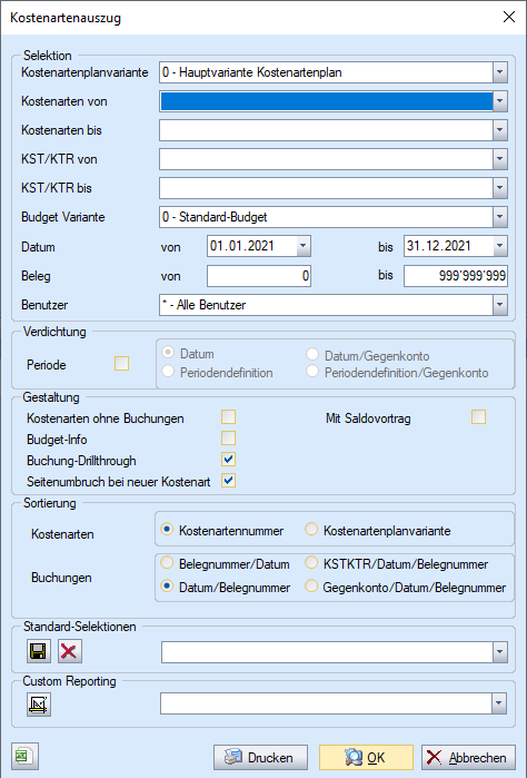 Kostenarten bis | Konto, bis zu welchem der Kontoauszug ausgegeben werden soll. |