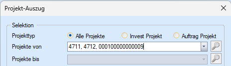 Projekte von | Projekt, ab welchem der Projekt-Auszug ausgegeben werden soll. Hinweis: Ab V2025.1 ist es möglich, ein String aus Projektnummern getrennt mit Kommas einzugeben und so einzelne spezifische Projekte auszuwerten. Beispiel: