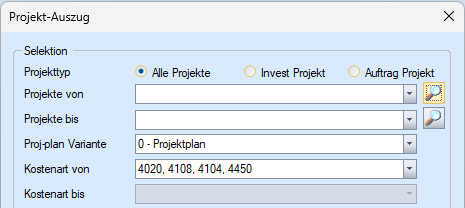 Kostenart von | Angabe, ab welchem Konto Buchungen im Projekt-Auszug ausgegeben werden soll. Hinweis: Ab V2025.1 ist es möglich, ein String aus Kontonummern getrennt mit Kommas einzugeben und so innerhalb der selektierten Projekte nur Buchungen von einzelnen spezifischen Kostenarten auszuwerten. Beispiel: