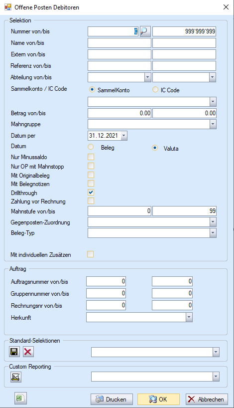 Referenz von/bis | Mit Hilfe der Debitoren-Referenznummern Debitoren eingrenzen, die auf der Offenen-Posten-Liste erscheinen sollen. | ||||||