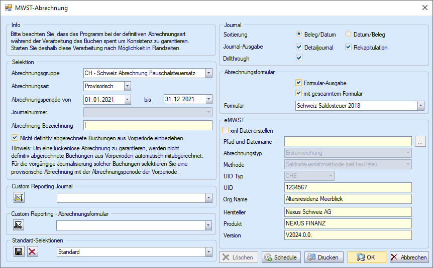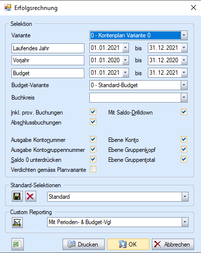 Erfolgsrechnung von/bis | Datumsbereich von/bis, für welchen der Saldo für das aktuelle Jahr berechnet und ausgegeben werden soll. |