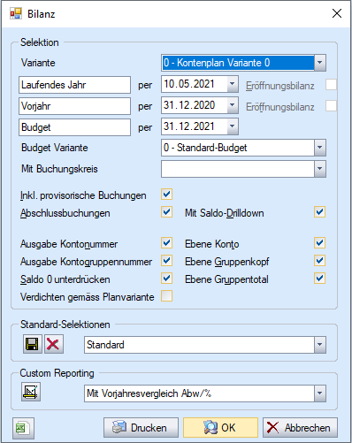 Vorjahr per | Per-Datum, für welches der Saldo für das Vorjahr berechnet und ausgegeben werden soll. Hinweis: Der Basisreport gibt nur eine Spalte für das aktuelle Jahr aus. Für einen Vorjahresvergleich müssen Sie im Feld Custom Reporting einen Standard-Custom-Report mit Vorjahresvergleich wählen. |